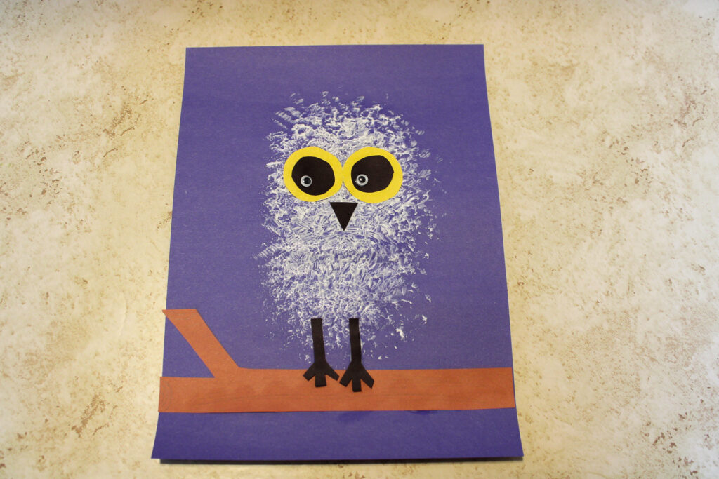 two legs and beak. - On the brown construction paper create a limb for the owl to perk on. Give it extra detail
